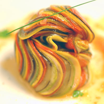 Oh and in French "courgette" means zucchini. It can also designate the light green sort of zucchini that's called 西葫芦 in China. In so far as Keller "inventing" it he was asked by the directors how he would make ratattouille for the toughest food critic in the world, and he came up with the plating you see in the movie. However this was not his first referance to the "byaldi" dish as it was previously published in the French Laundry cookbook, as well as served in the restaurant prior to that. As to the actual origins of slicing a rattatouille instead of dicing it, like many culinary origins it is not exactly well documented. Keller certainly has made this preperation popular though. While I agree he may have contributed to make it popular in the US, but this dish has been eaten for decades if not centuries in the South of France. And when I say this dish, I don't mean ratatouille, I really mean this recipe, although as mentioned in my previous post, the traditional recipe substitutes the pepper mixture with a similar onion mixture. Don't misunderstand me, as a French cuisine specialist and food enthusiast I obviously have a huge respect and a lot of admiration for Keller, but he certainly did not invent this dish. His way of presenting it is really sick though, the picture is amazing. To settle this argument... This is a ratatouille: ![[image loading]](http://www.le-beausset-en-provence.com/images/beausset-cuisine/cuisine-ratatouille-proven%C3%A7ale.jpg) This is a Tian à la Provençale: ![[image loading]](http://recettessimples.fr/images/Tian_Courgettes_Tomates_cuit_t.800.jpg) What actually happened for the movie Ratatouille (my guess): they were looking for a typically french-sounding dish, and stumbled upon the name "Ratatouille". However, as you can see above, a ratatouille is not very visually appealing. For this reason, they kept the name "Ratatouille", but showed it as a "Tian à la Provençale" in the movie (because the ingredients are very similar). So no, Keller did not invent anything about this dish, but I must agree with the fact that the presentation he did is very good  . Trust me, I'm a Frenchman, and I love both Tian and Ratatouille !
